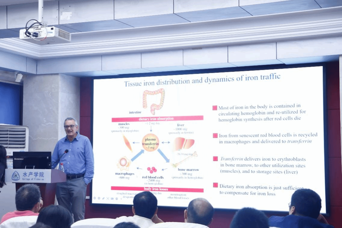 2025年第07期(总420期)“水产讲坛”在水产楼A座201报告厅举行,特邀 Kostas Pantopoulos 教授作专题学术报告,报告题目为“Systemic iron metabolism in health and disease: Lessons from mouse models”。Kostas Pantopoulos 教授主要以小鼠为模型,介绍他实验室在个体水平的铁代谢及其调控领域的研究成果,为理解铁元素的生理功能及其相关病理模型中的铁代谢调控特征提供了新的视角。本次讲座由水产动物分子营养方向的罗智教授主持。