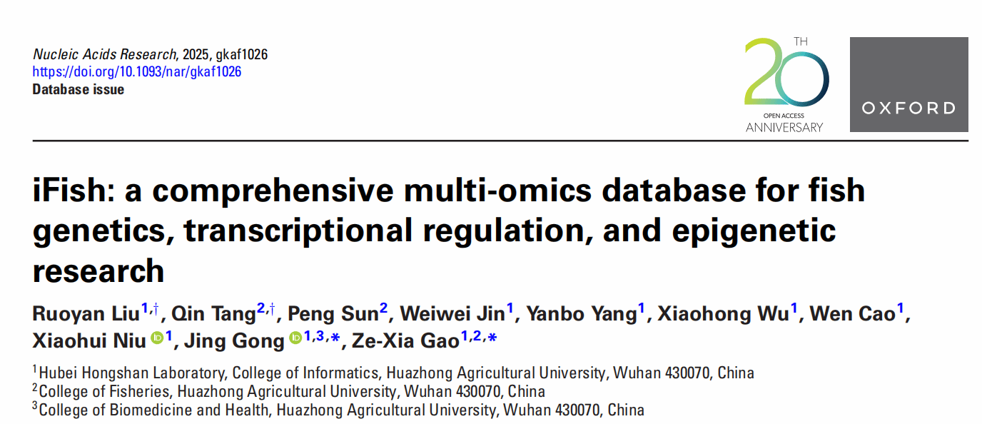 高泽霞教授团队联合信息学院龚静教授团队在Nucleic Acids Research期刊上发表题为“iFish: a comprehensive multi-omics database for fish genetics, transcriptional regulation, and epigenetic research”的研究论文。该团队开发的“iFish”综合性鱼类多组学数据库(//gonglab.qpyule.com/iFish/),不仅整合了基因组图谱、基因表达谱、表观遗传修饰及蛋白质组数据,还实现了遗传变异、转录因子(TFs)及非编码RNA(ncRNAs)的系统鉴定。它是迄今为止系统整合、分析和存储鱼类多组学数据的最全面平台,将成为鱼类遗传学、转录调控和表观遗传学研究的重要资源。